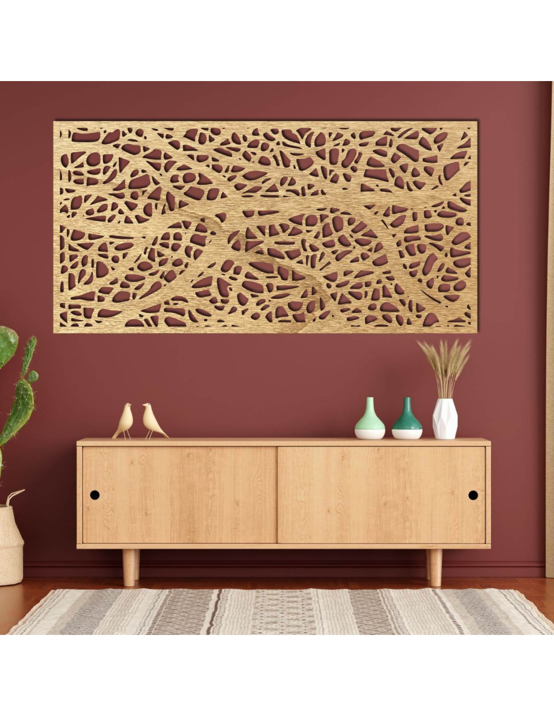Egy elegáns, rétegelt lemezből készült, faragott fa motívummal díszített kép természetes harmóniát és egyedi stílust kölcsönöz otthonának, alkalmas nappaliba, hálószobába vagy irodába.