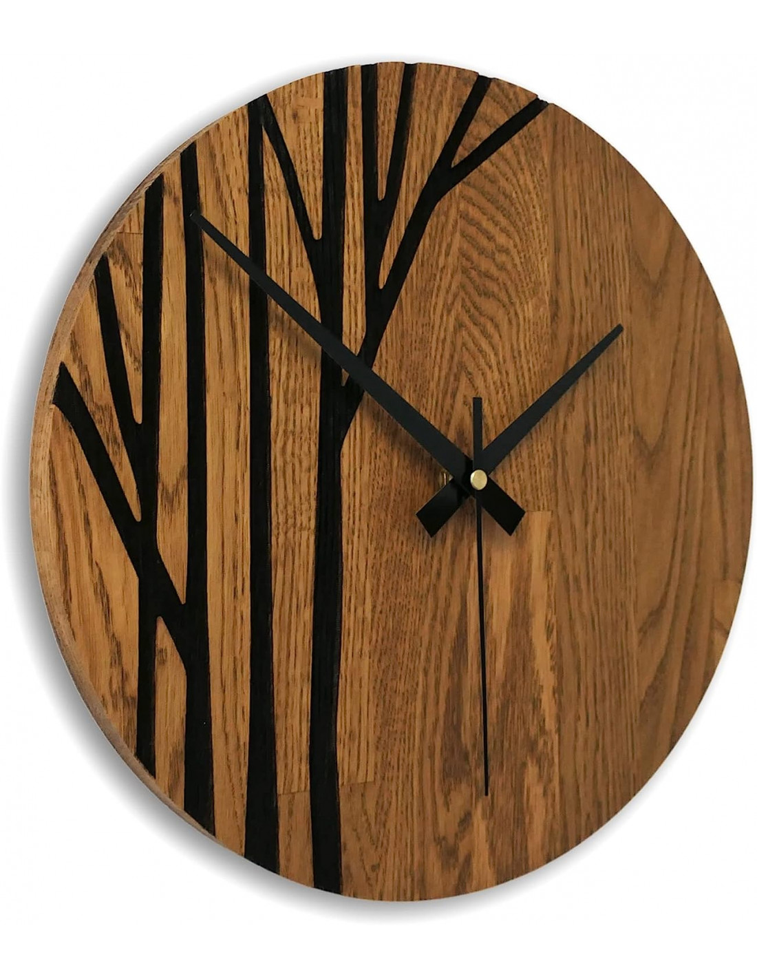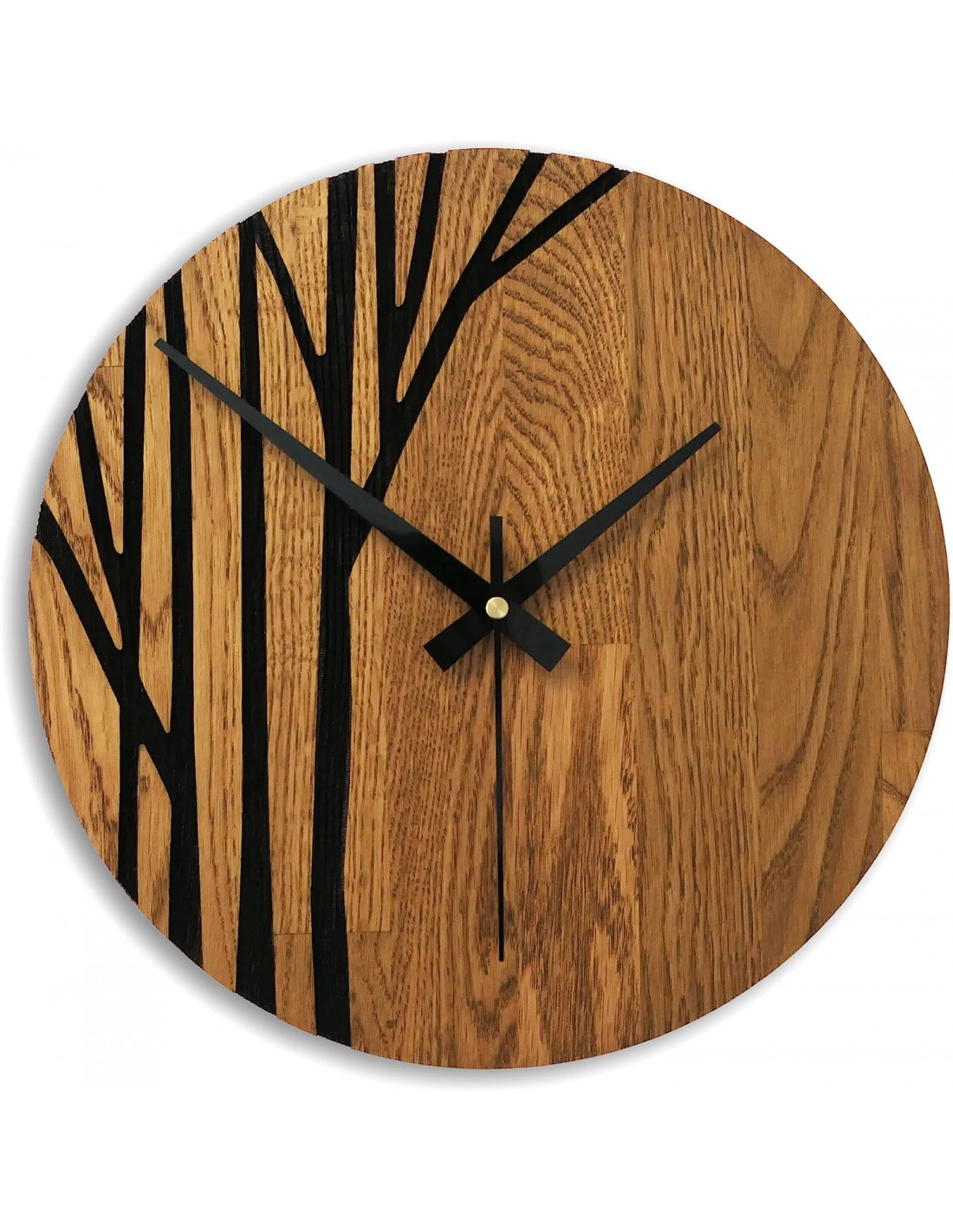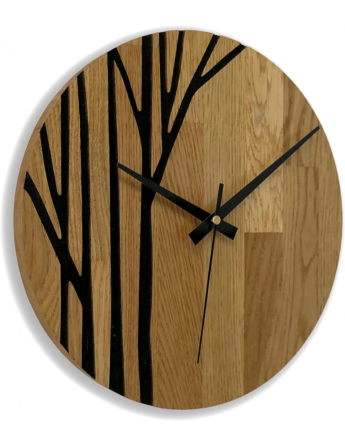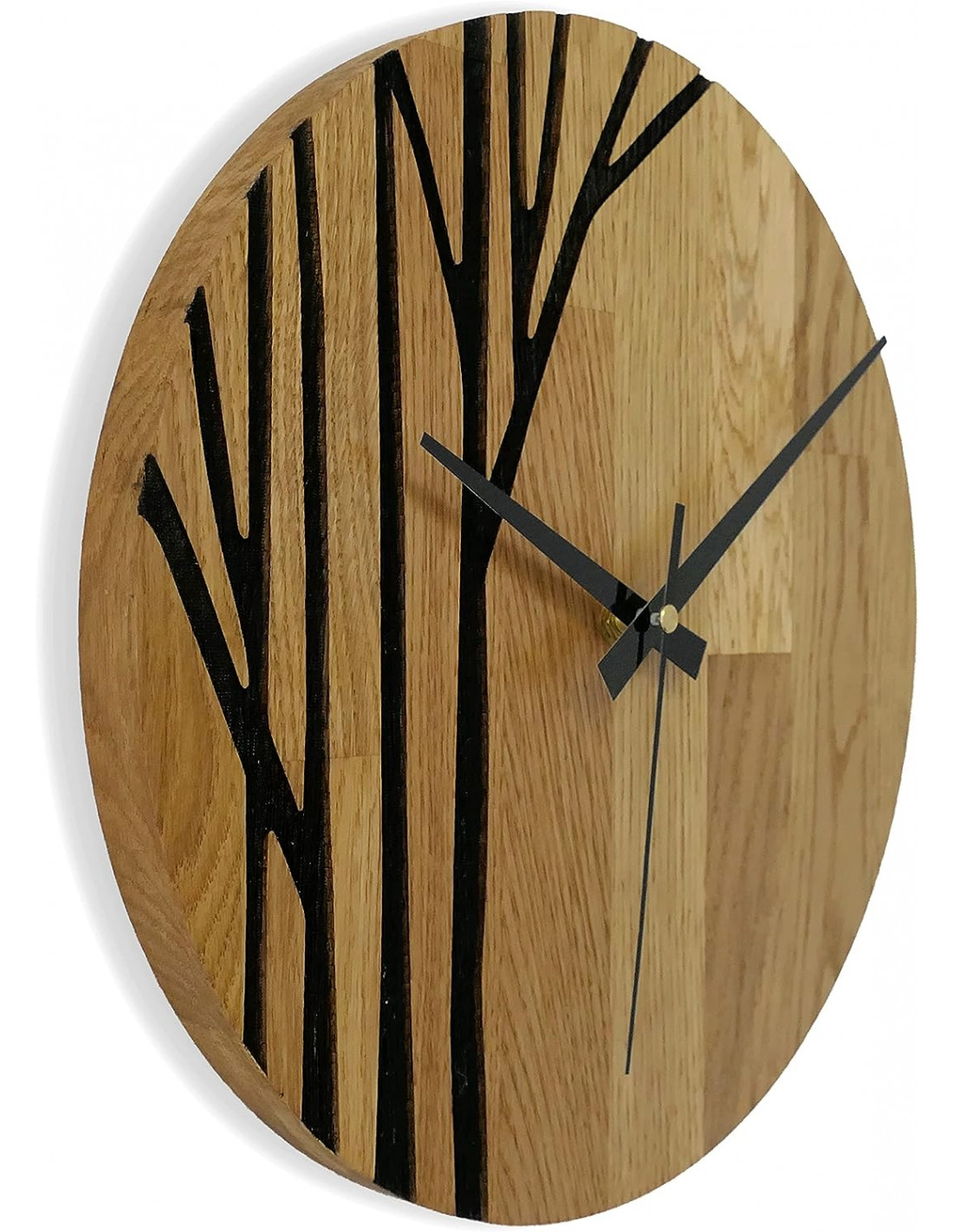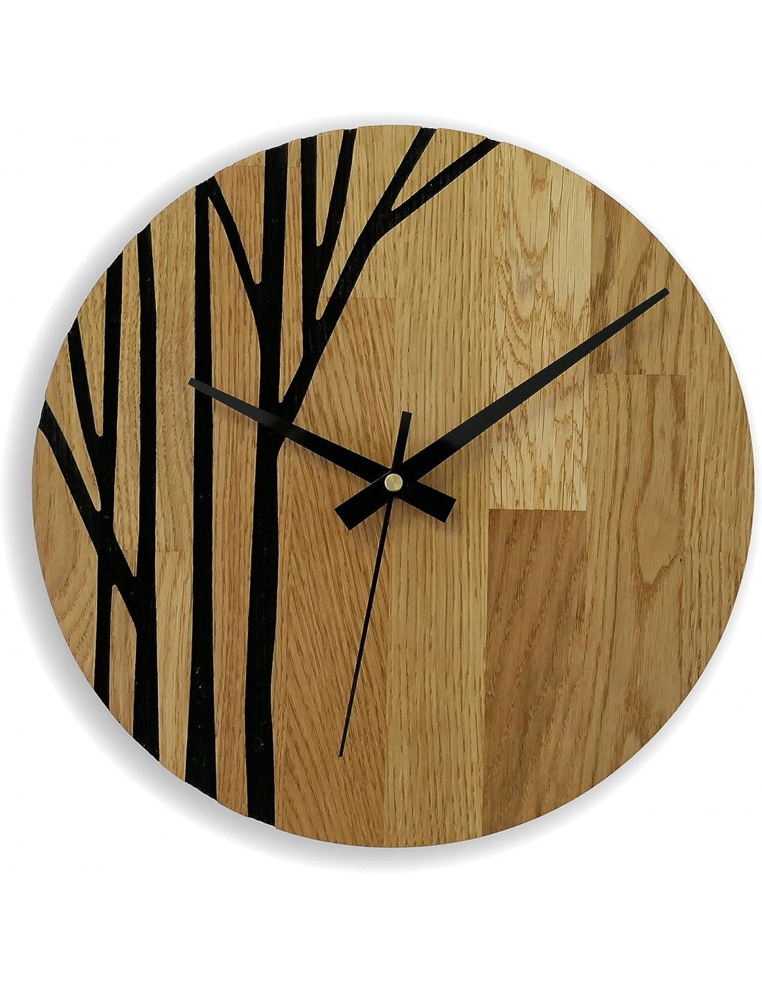 Fából készült falióra fekete mutatókkal és modern mintával.