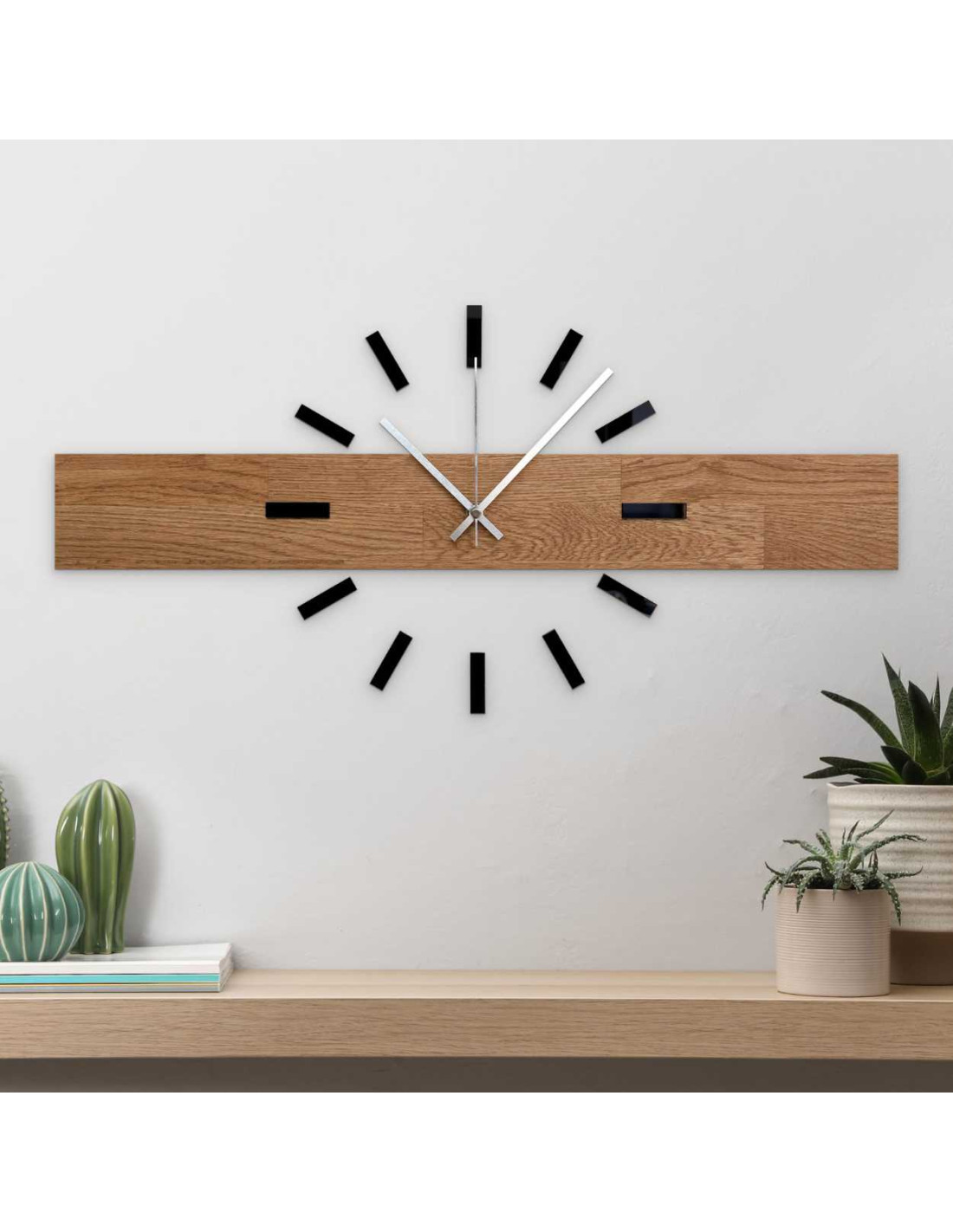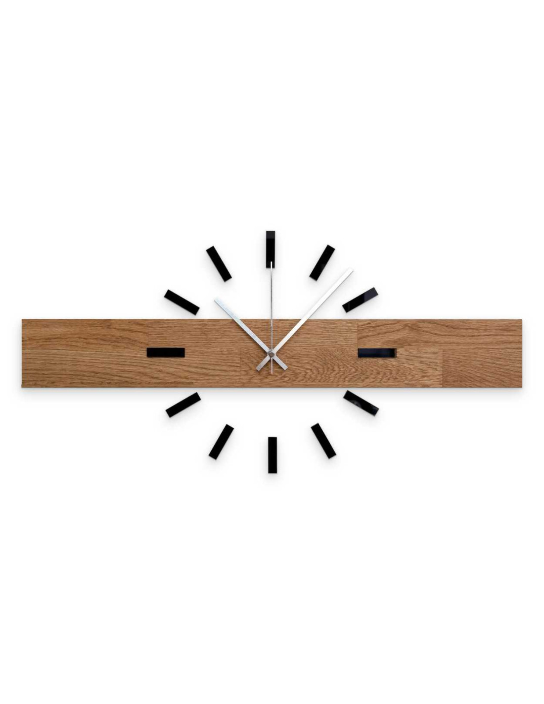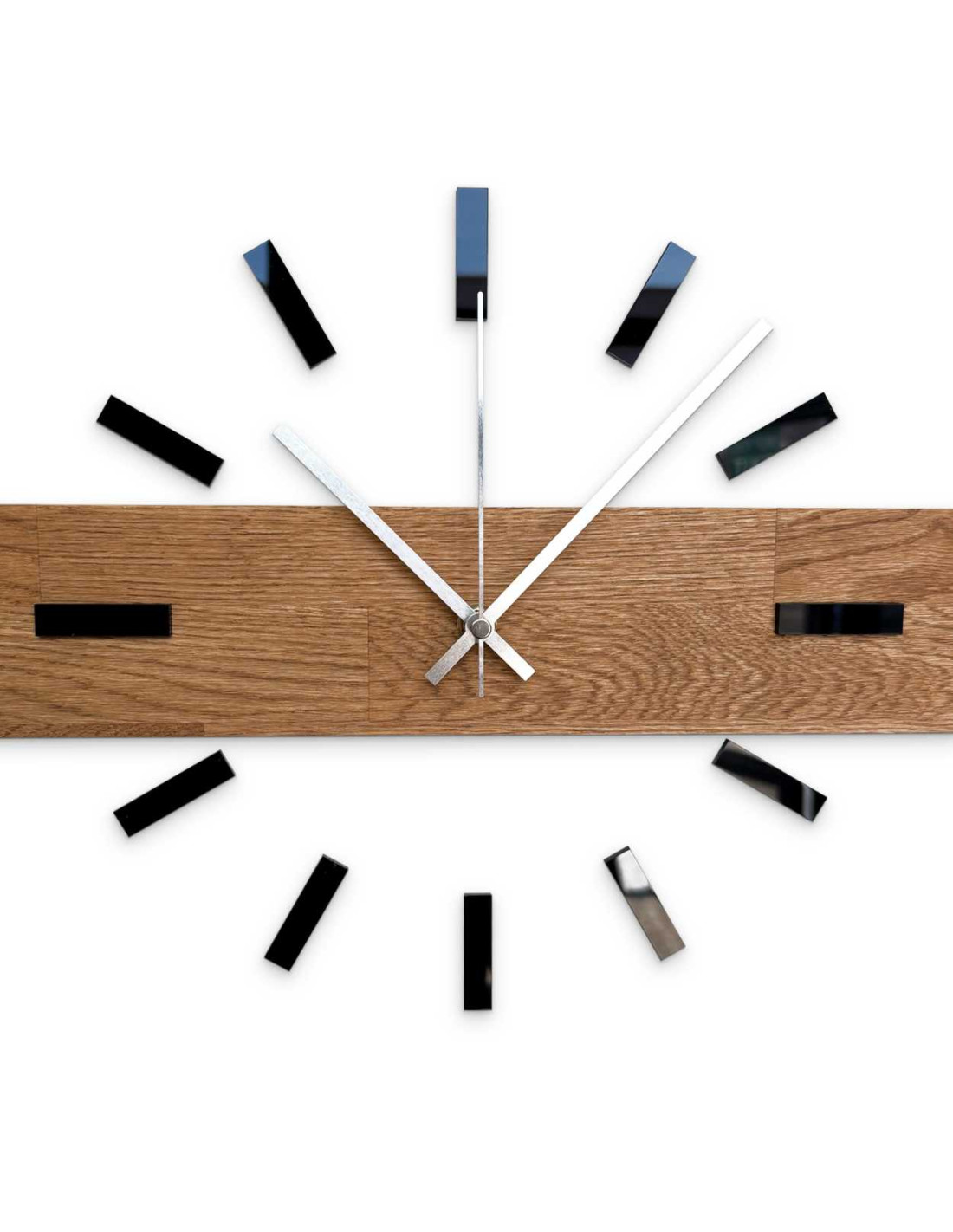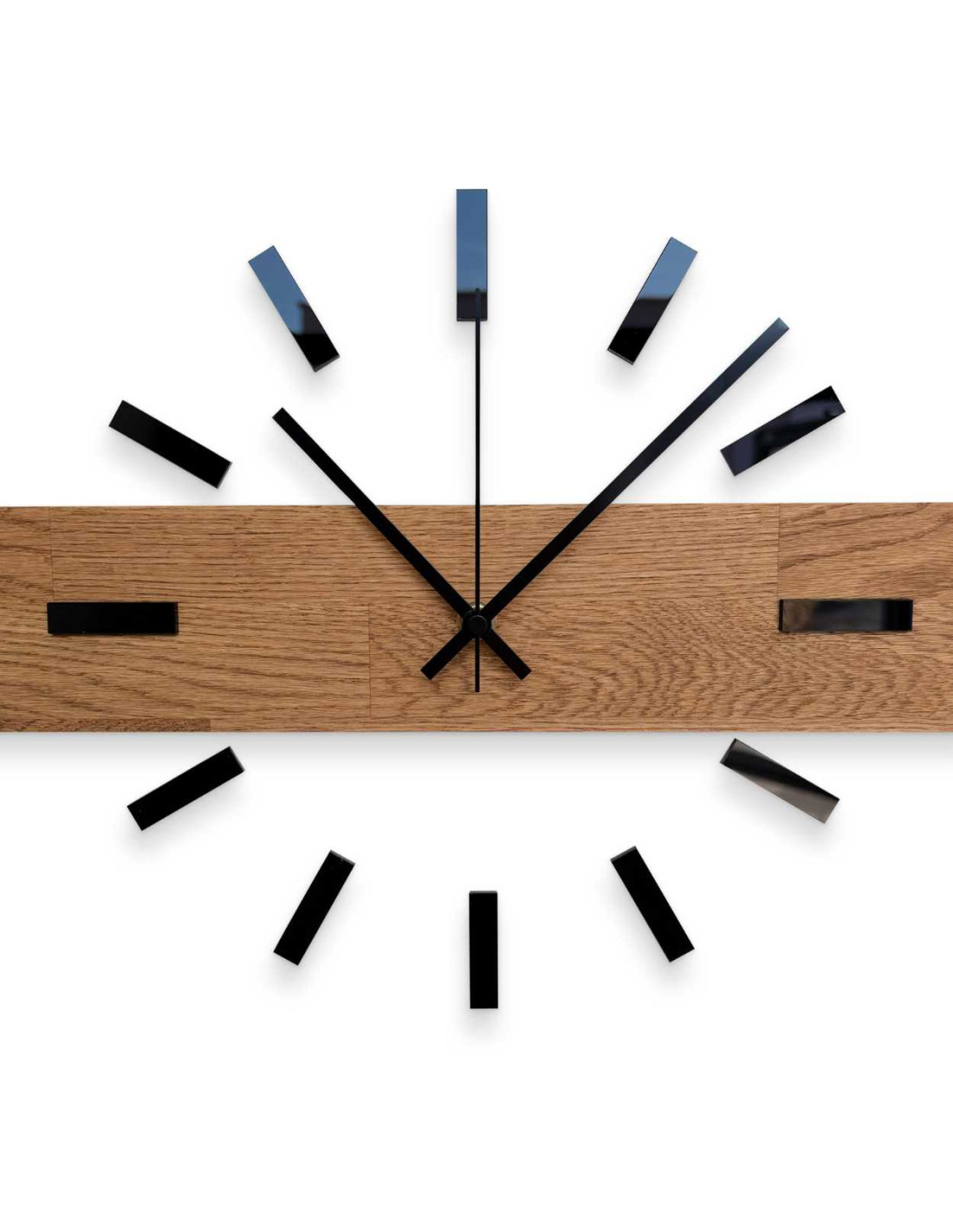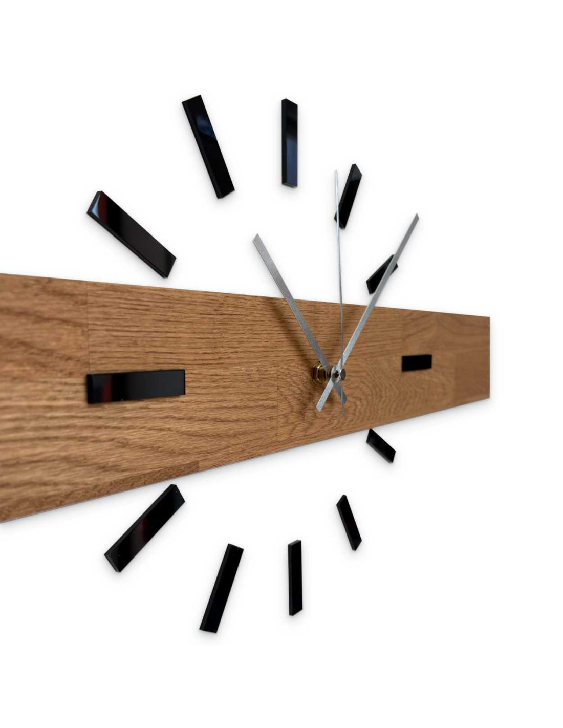 Nagyméretű, modern dizájnú, fából készült óra mindennapi használatra.