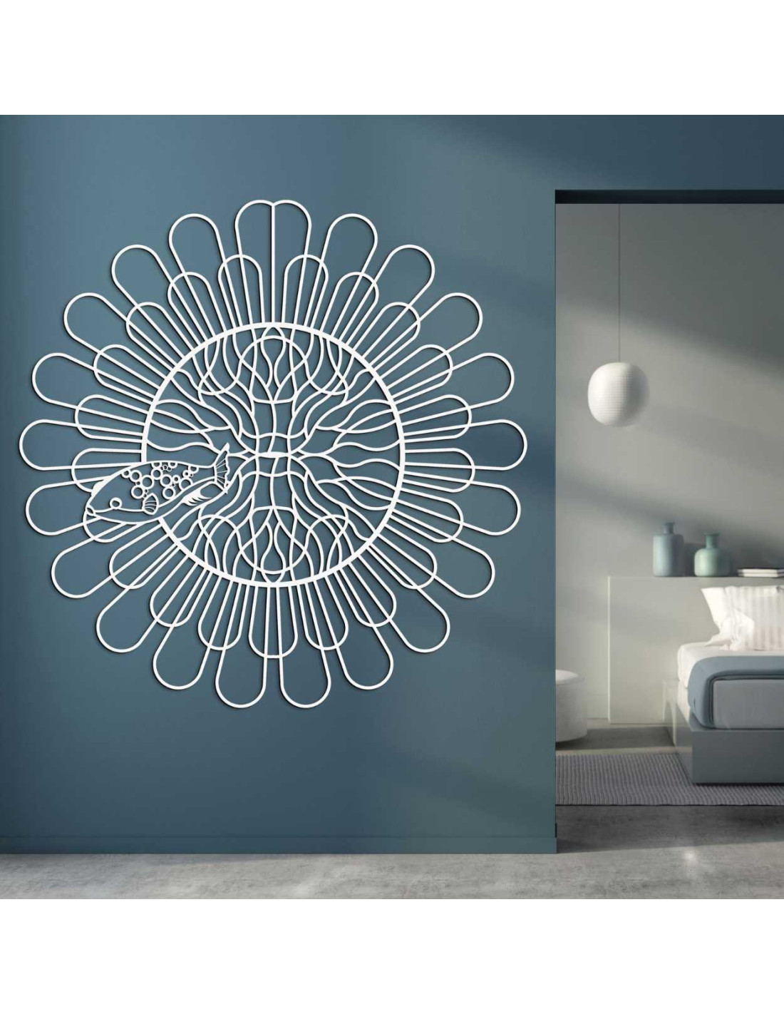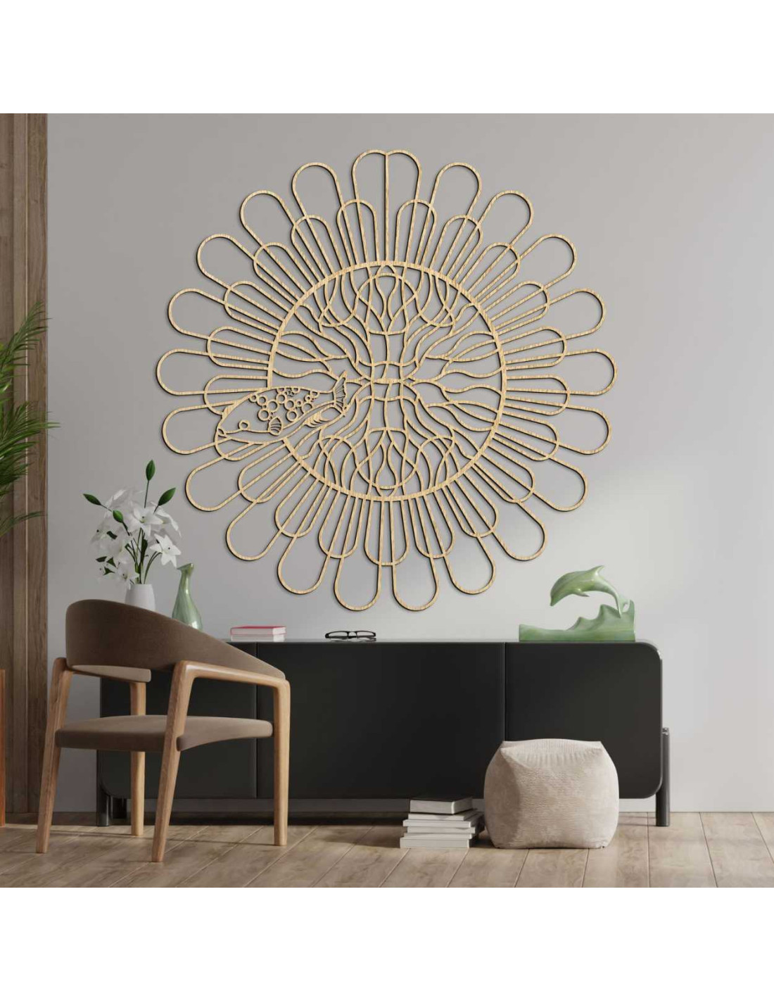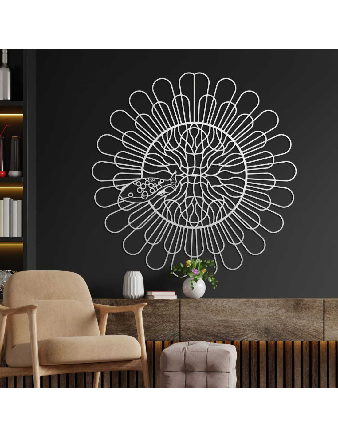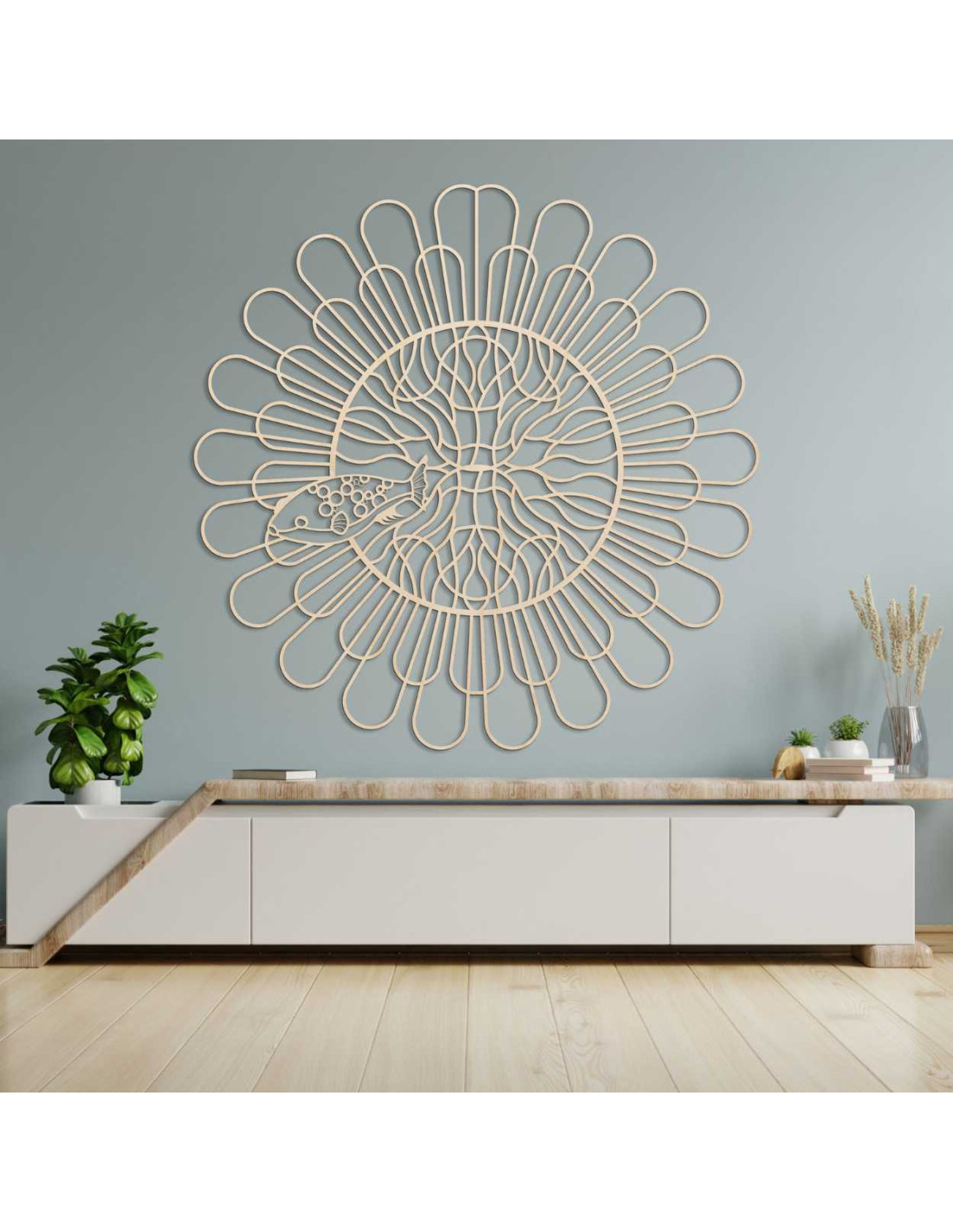 Az egyenletesen elosztott vonalak a mozgás és a struktúra illúzióját keltik. A központi térbe egy finoman faragott, kontrasztos részletekkel ellátott halmotívum került beépítésre. Az organikus forma megzavarja a kör technikai pontosságát, kontrasztot teremtve. Az egész dizájn a rend és a véletlen közötti egyensúly vizuális kifejeződéseként működik.