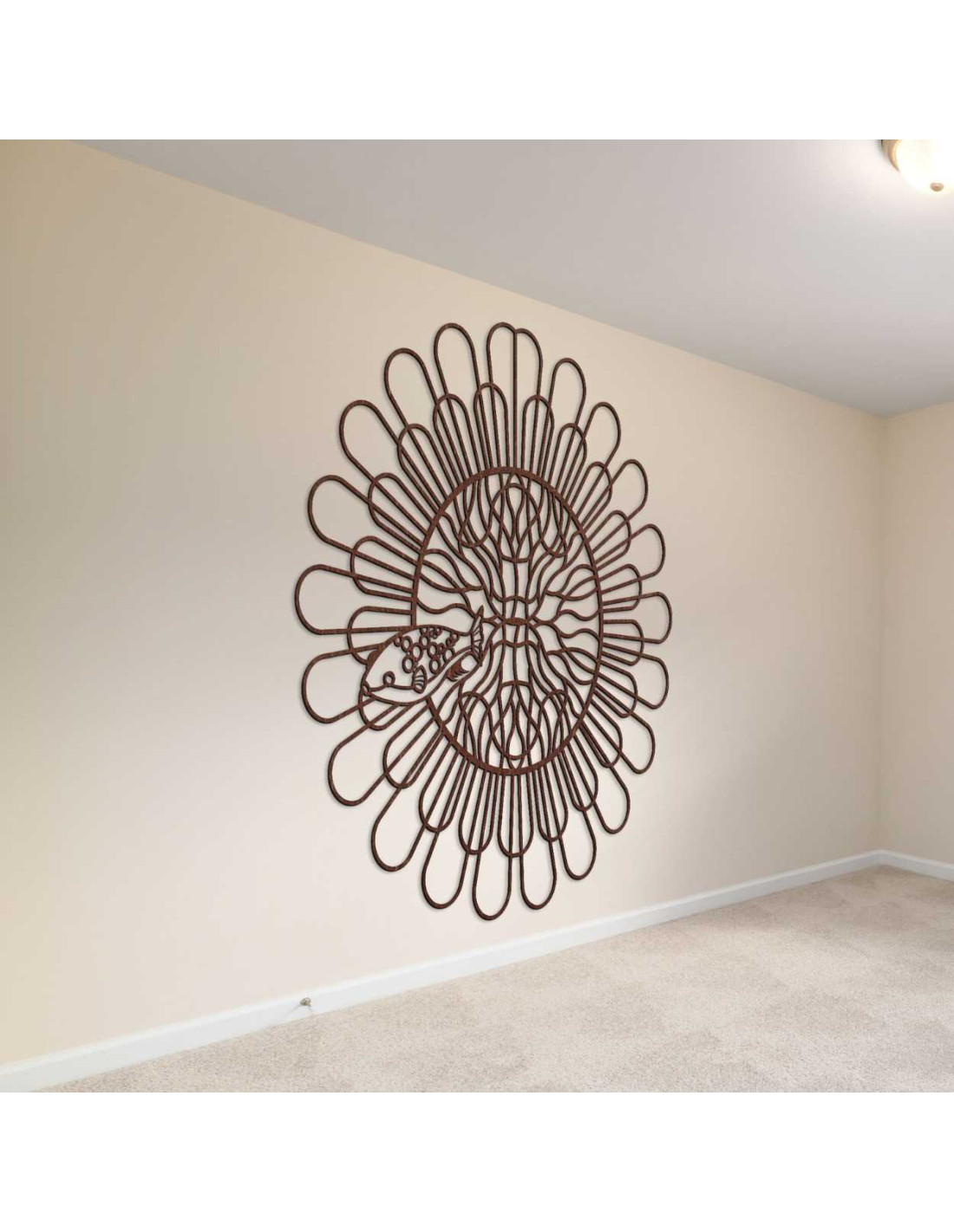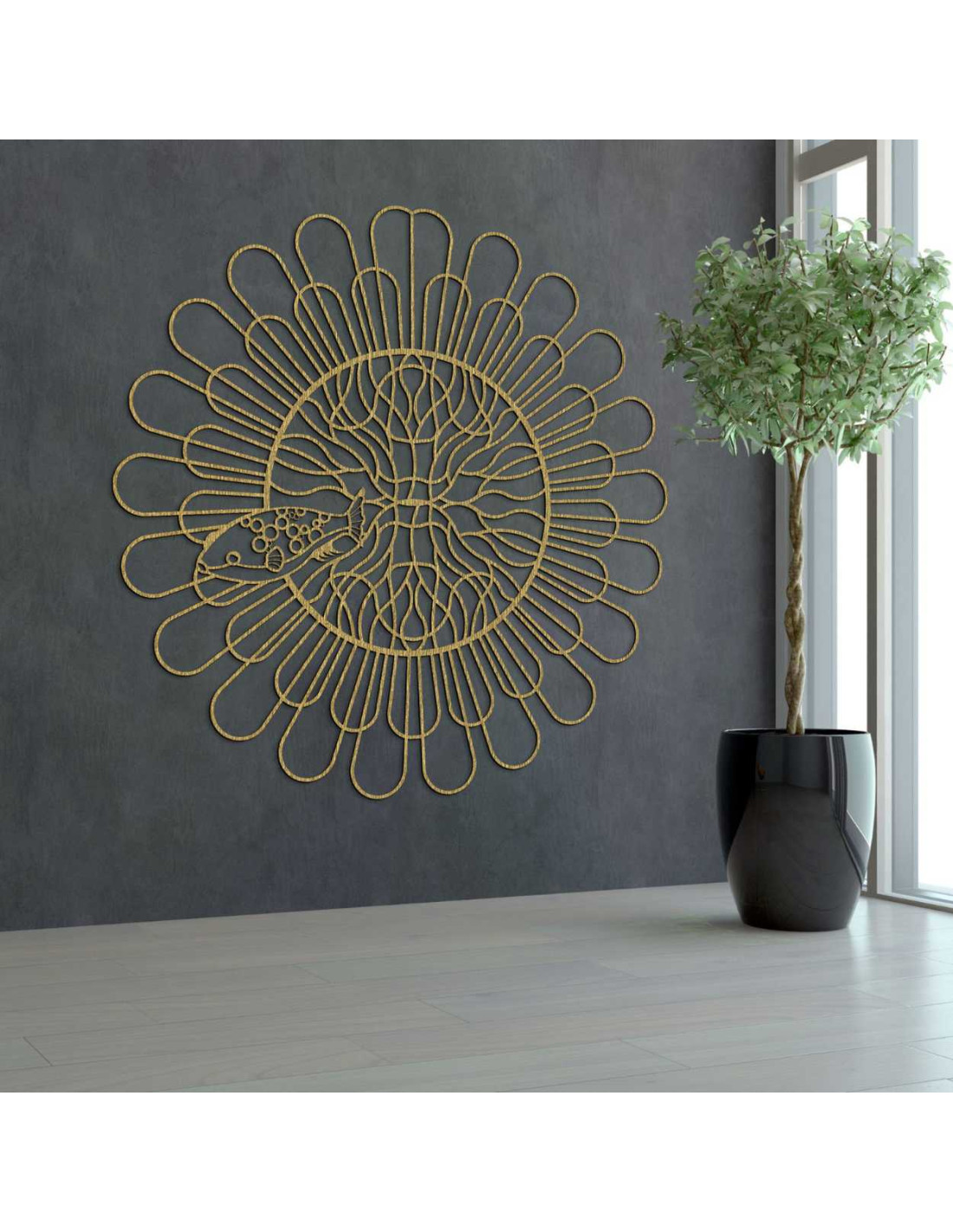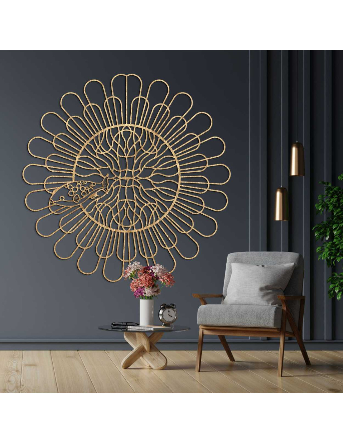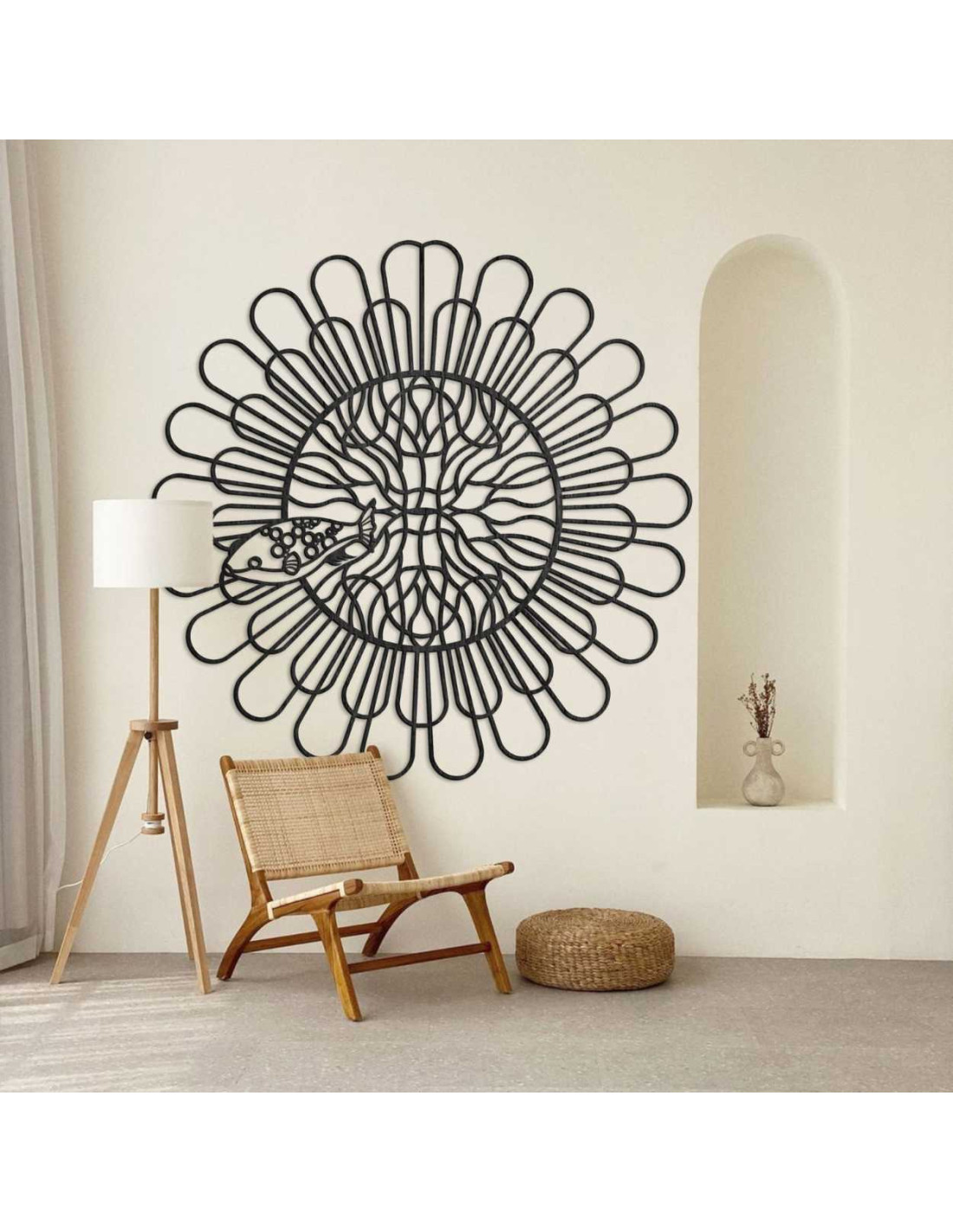 Az egyenletesen elosztott vonalak a mozgás és a struktúra illúzióját keltik. A központi térbe egy finoman faragott, kontrasztos részletekkel ellátott halmotívum került beépítésre. Az organikus forma megzavarja a kör technikai pontosságát, kontrasztot teremtve. Az egész dizájn a rend és a véletlen közötti egyensúly vizuális kifejeződéseként működik.