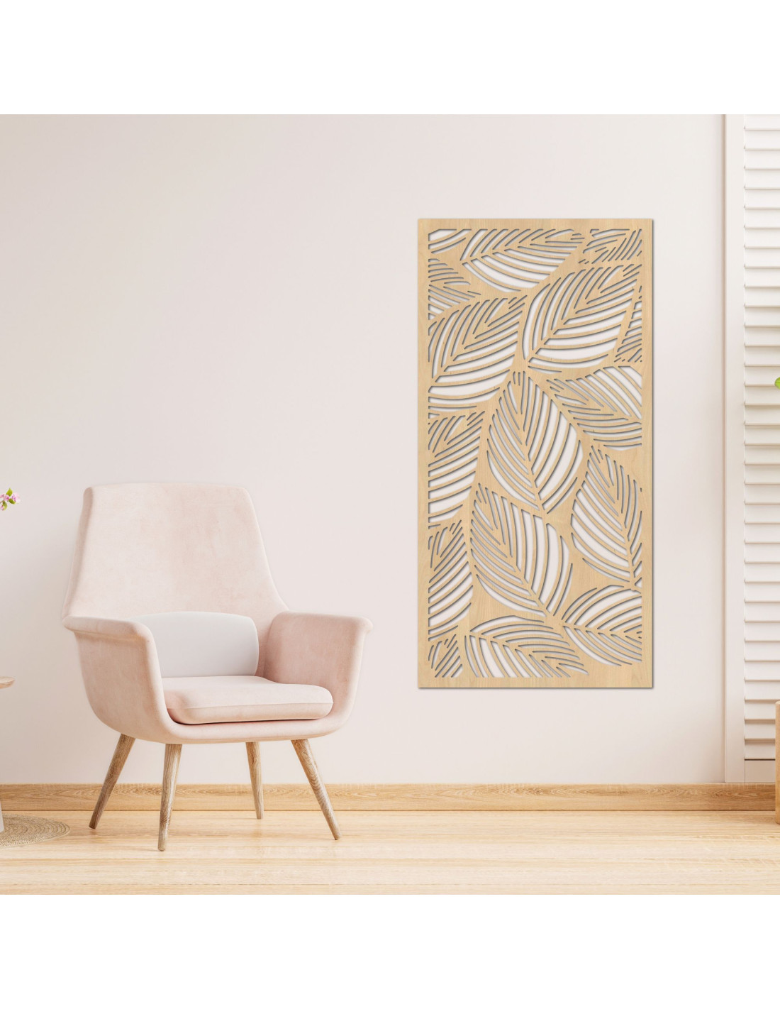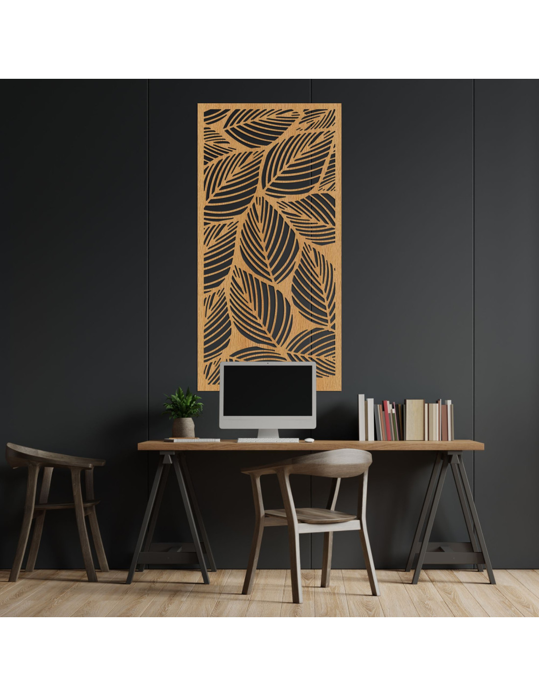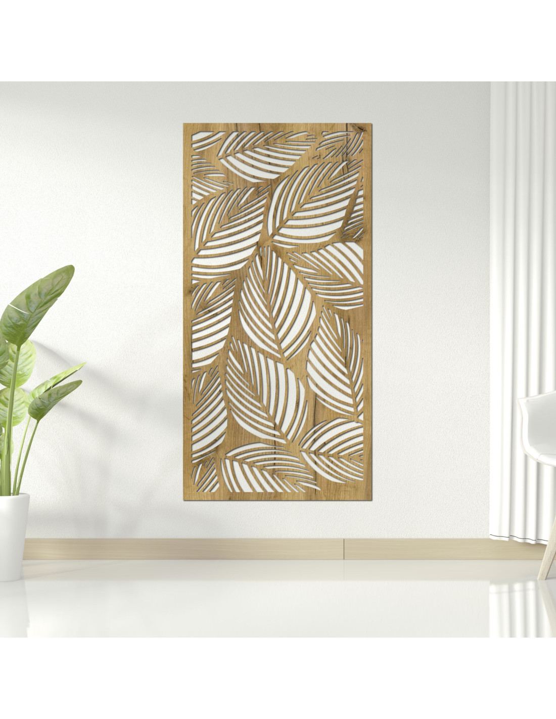 A levélmotívumos kialakítás a természet és a könnyedség jegyeit hozza a belső térbe. A precízen vágott részletek elegáns és modern megjelenést kölcsönöznek. Ideális dekoráció minimalista és természetes terekbe egyaránt.