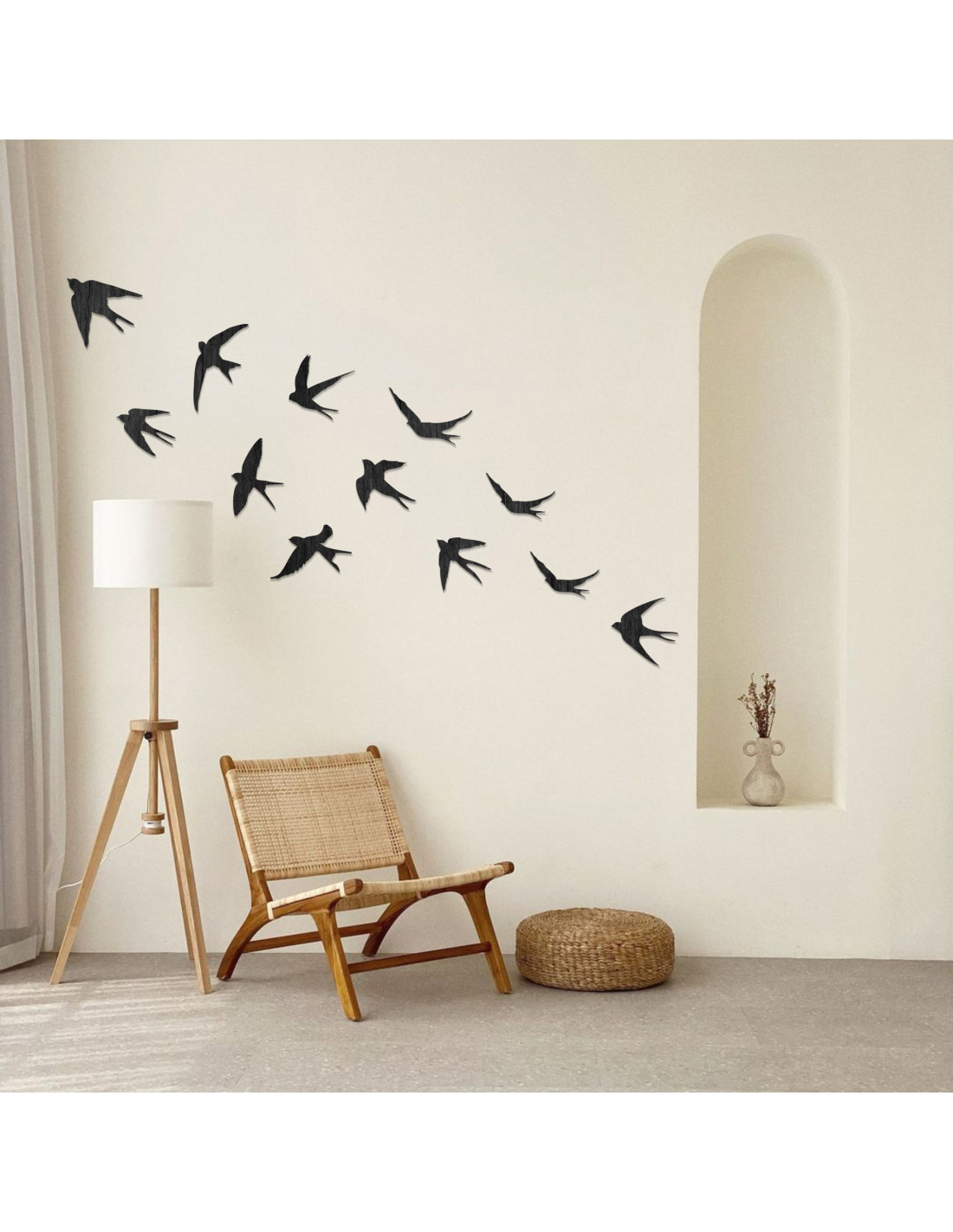 Ezek a fából készült fecskék a szabadságot , a mozgást és az eleganciát szimbolizálják. Egy sötét fal előtt kiemelkednek, és a repülés érzetét keltik, dinamizmust kölcsönözve a térnek. Tökéletesek mind a modern, mind a rusztikus enteriőrökbe.