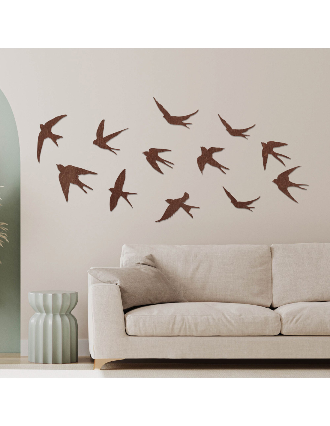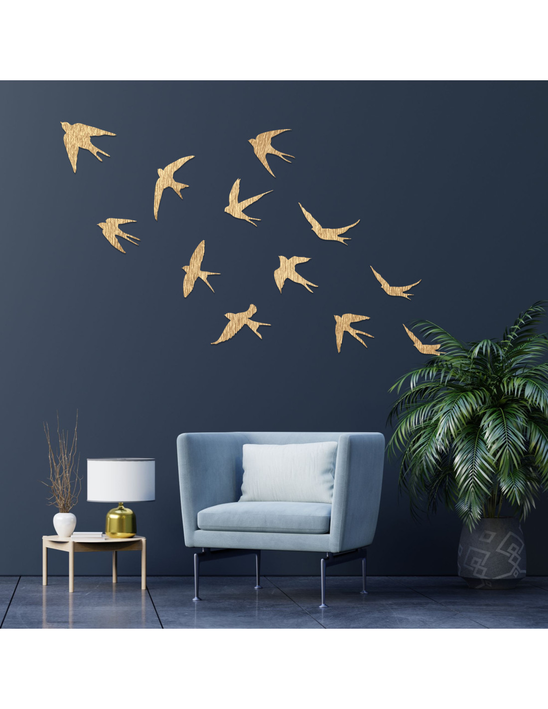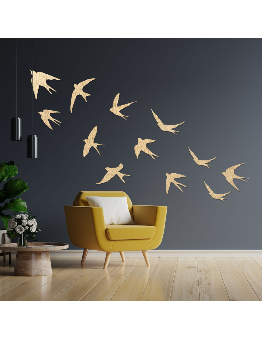 Ez a dizájn minimalista, nyári fecskéket formázó fa dekorációkat tartalmaz. A világos fa sziluettek kontrasztot alkotnak a sötét háttérrel, elegáns hatást keltve. Dinamikusnak tűnik és légiességet kölcsönöz a térnek.