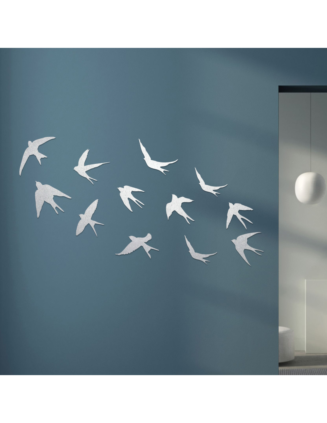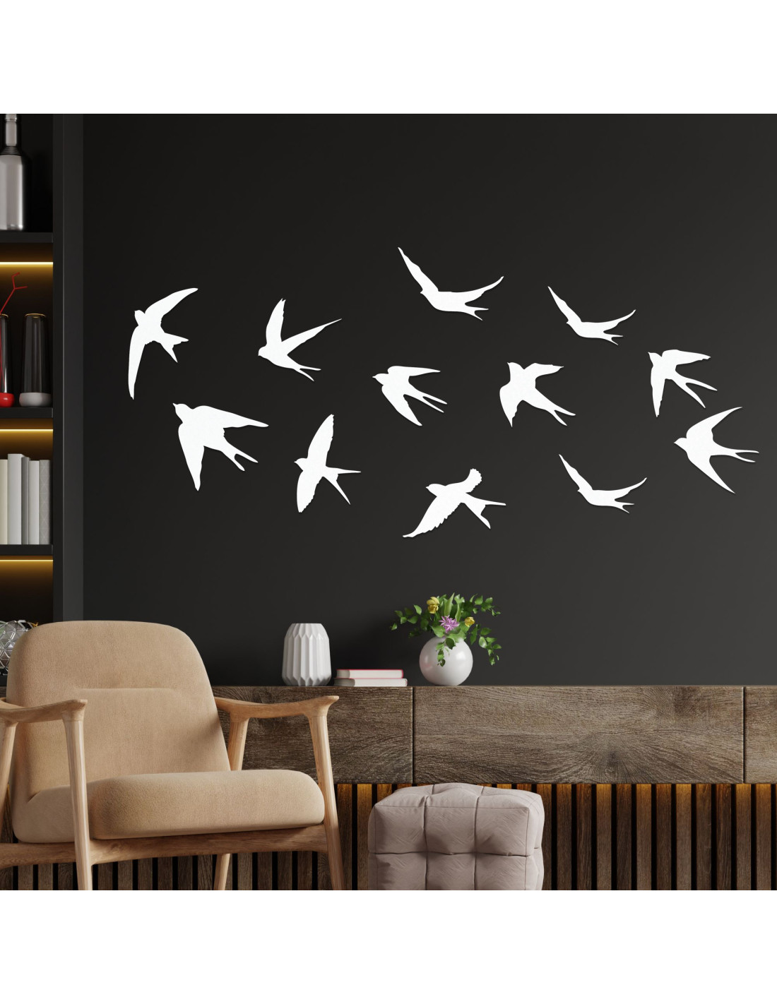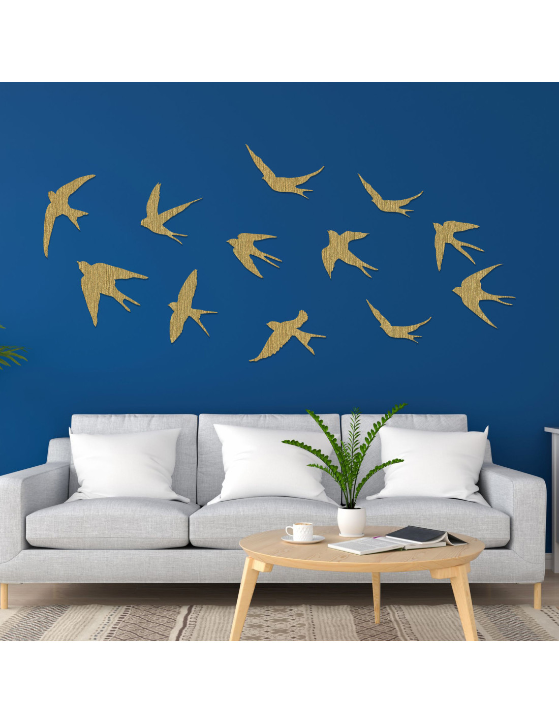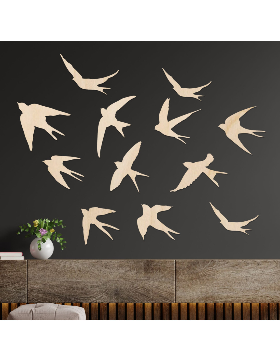 Ez a dizájn minimalista, nyári fecskéket formázó fa dekorációkat tartalmaz. A világos fa sziluettek kontrasztot alkotnak a sötét háttérrel, elegáns hatást keltve. Dinamikusnak tűnik és légiességet kölcsönöz a térnek.