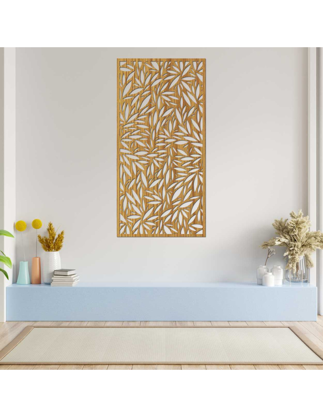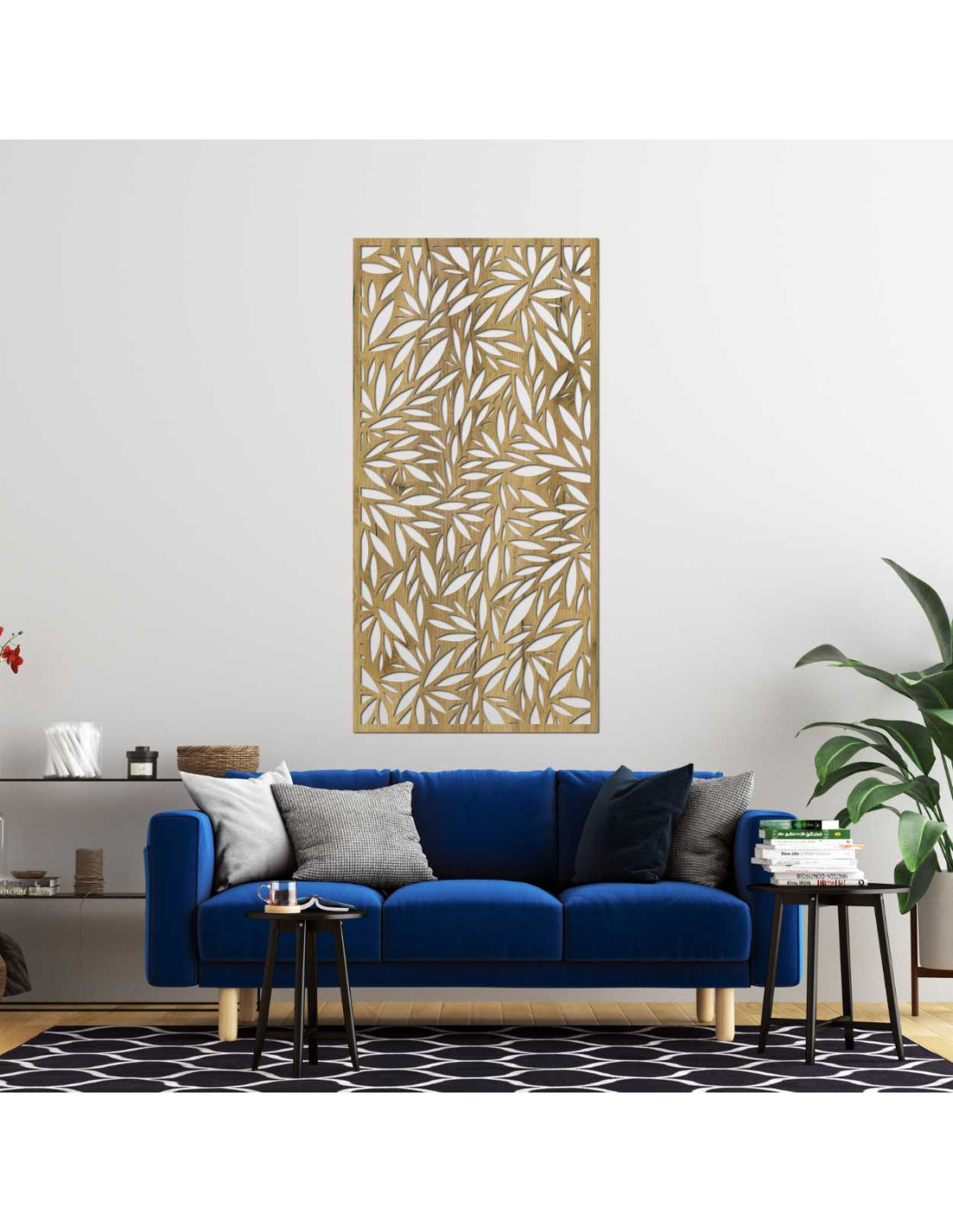 A növényi mintás fa kép eredeti dizájnt kölcsönöz részletesen faragott levelekkel.