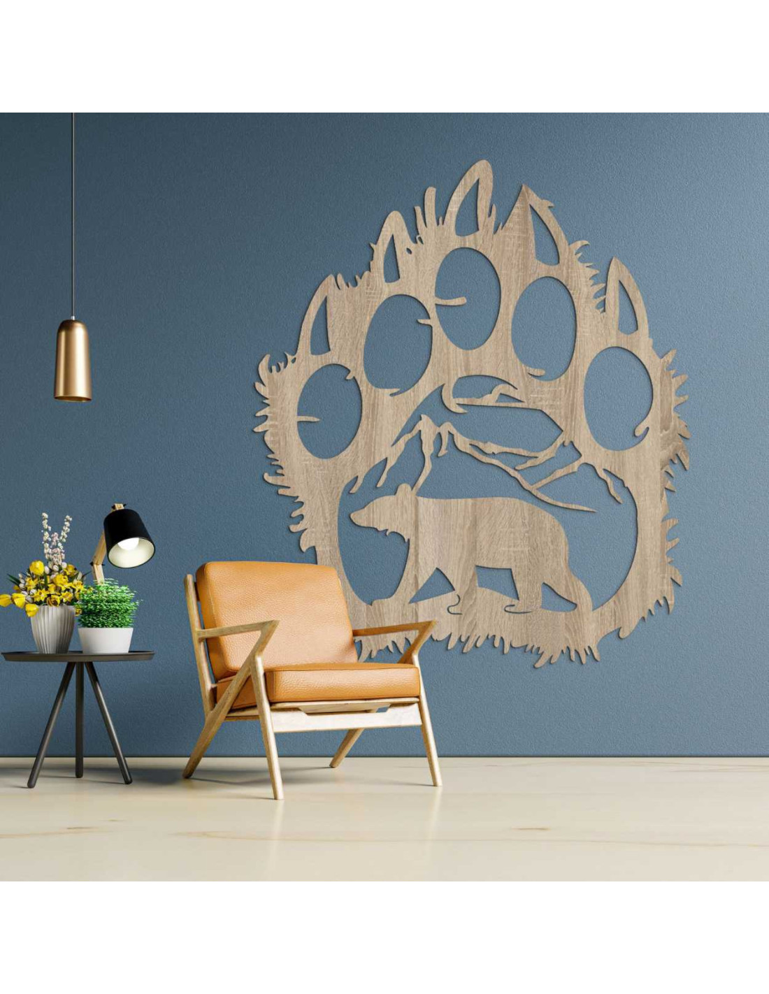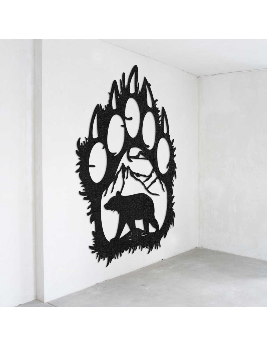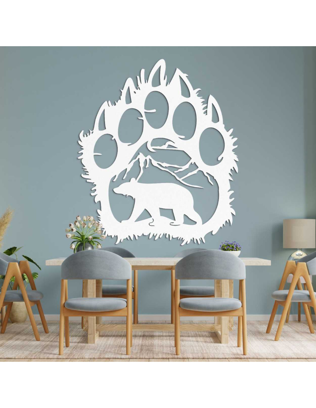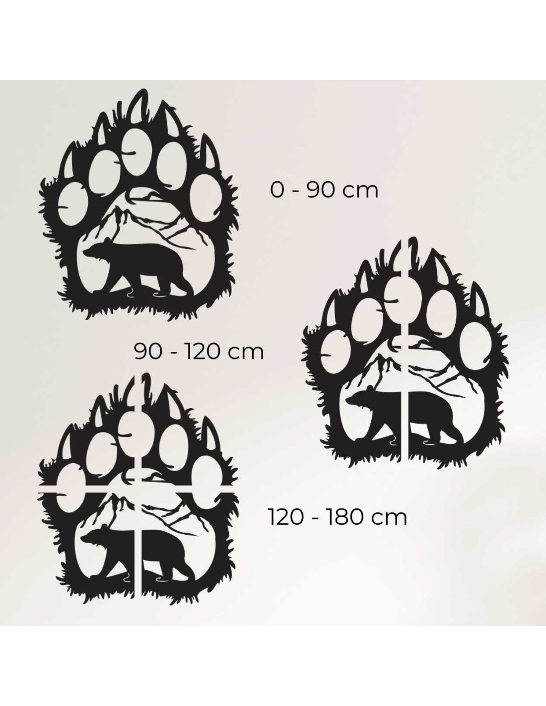 A medveösvény dinamikus sziluettje, amelyet természeti jelenetek egészítenek ki, karaktert és mélységet kölcsönöz a térnek.
