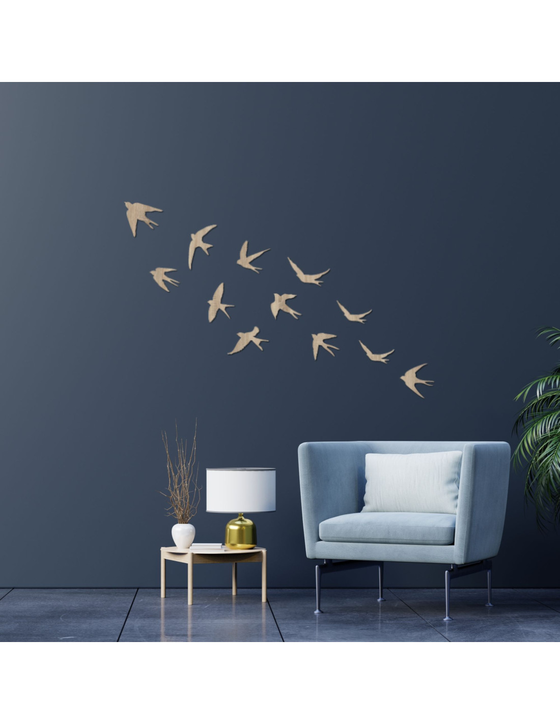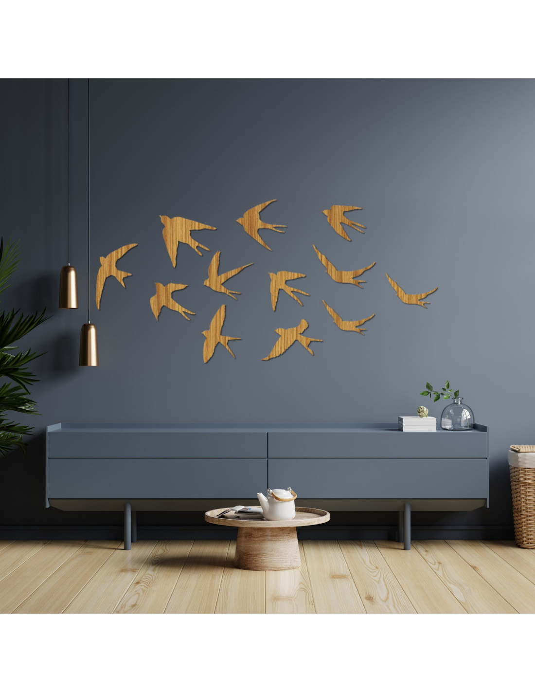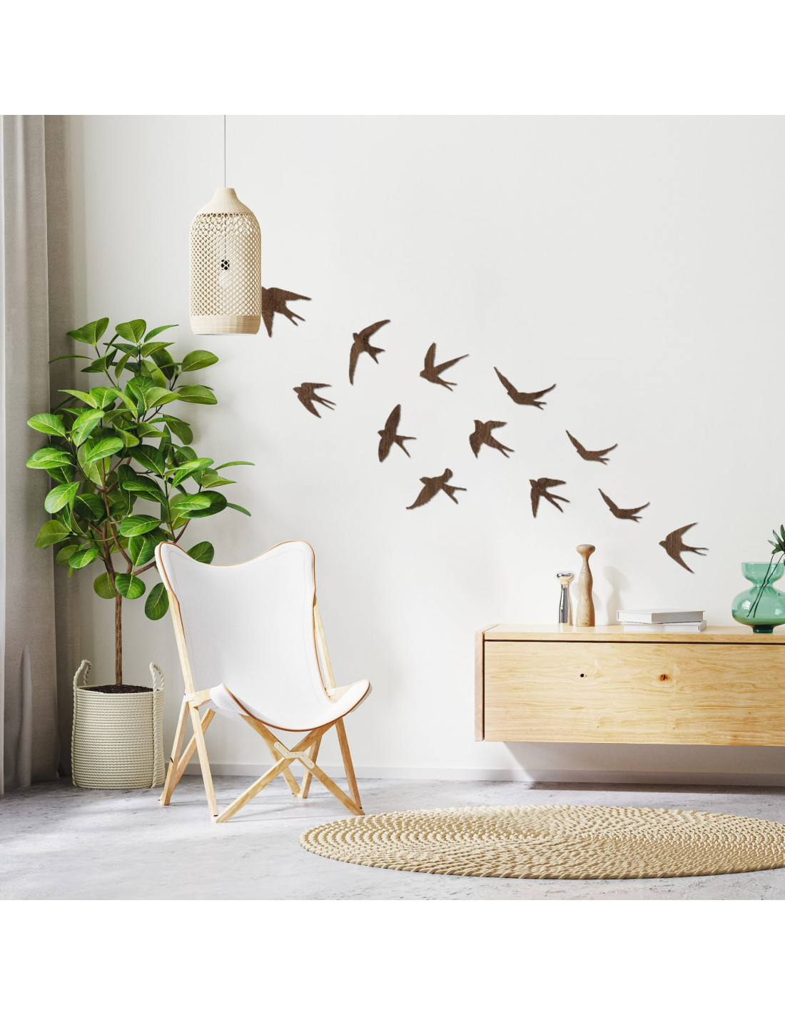 Ez a dizájn minimalista, fecskéket ábrázoló fa dekorációkat tartalmaz nyáron.