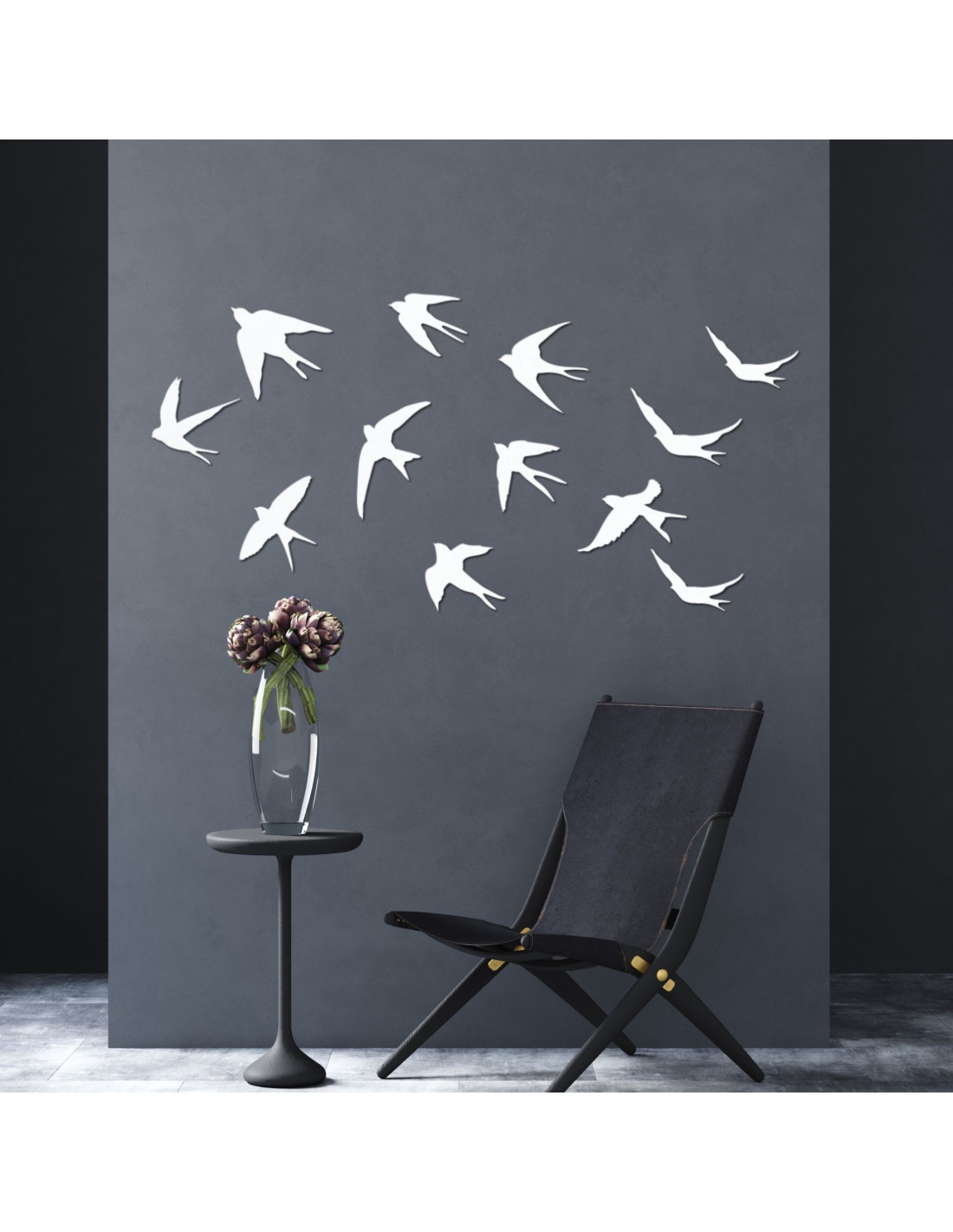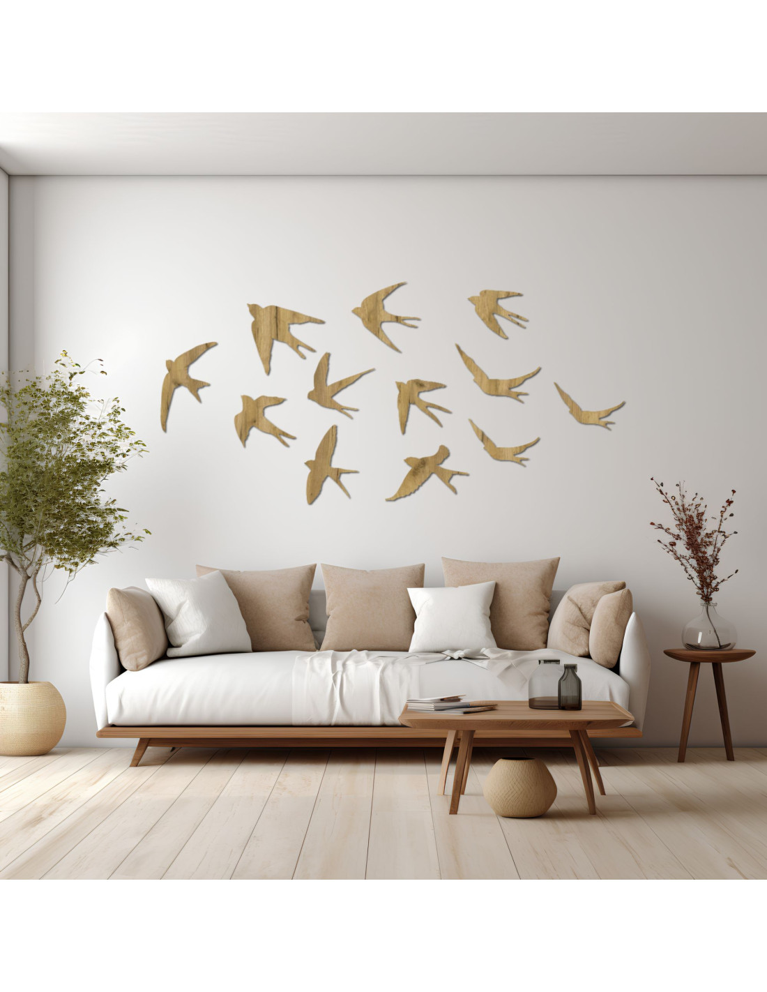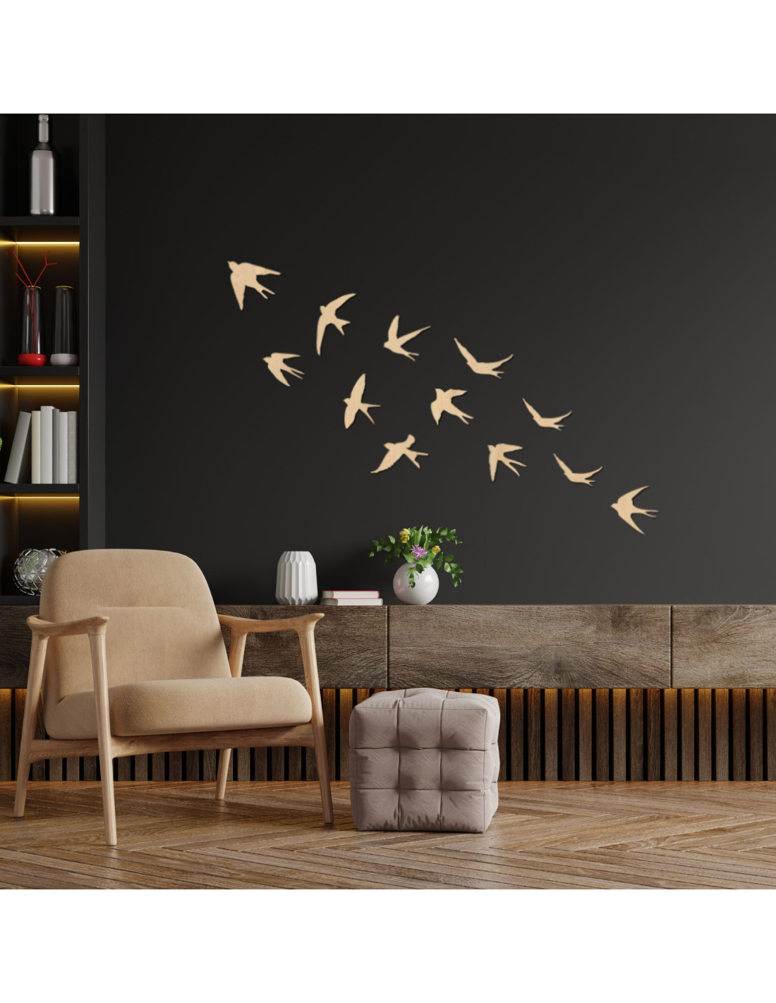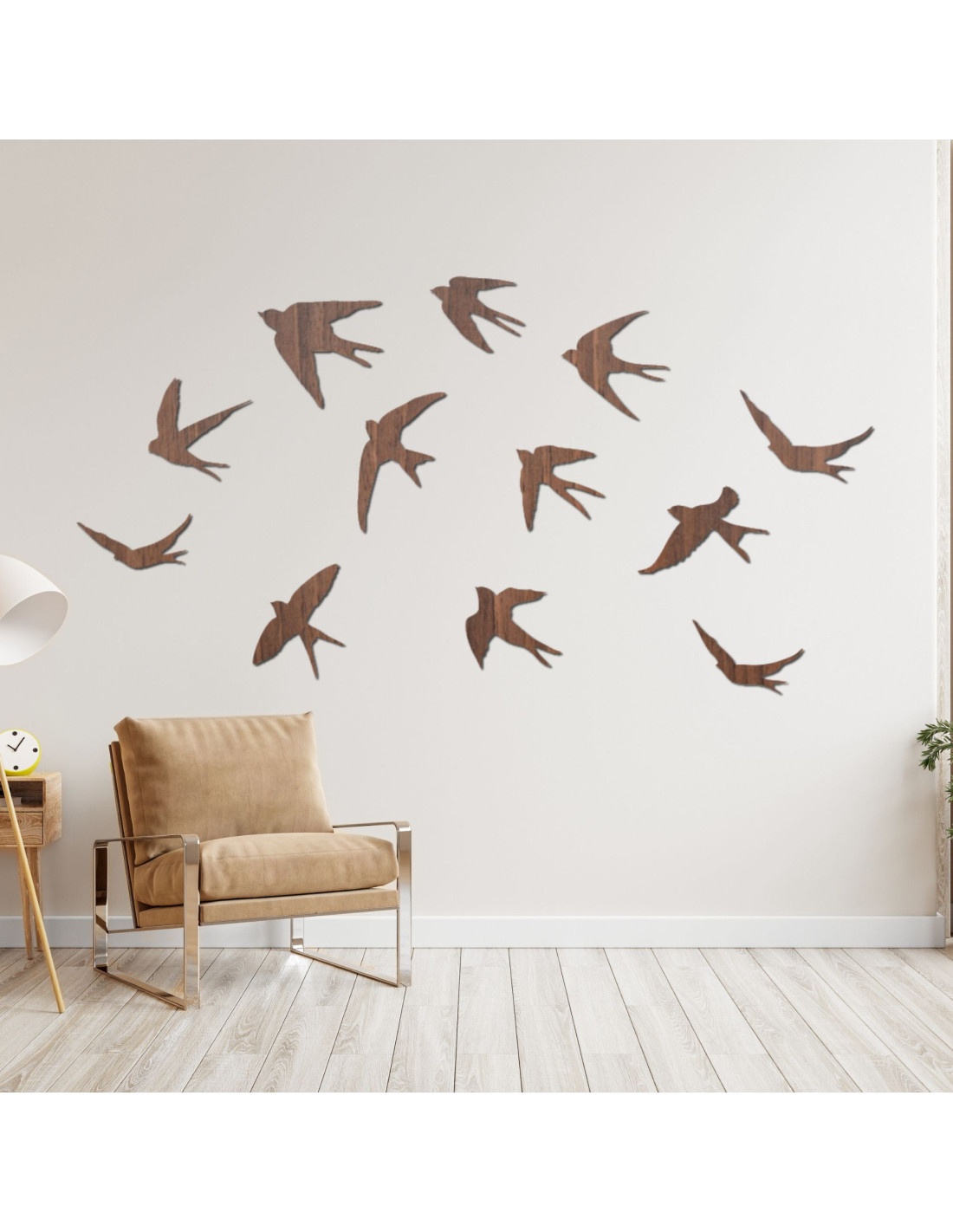 Ez a dizájn minimalista, fecskéket ábrázoló fa dekorációkat tartalmaz nyáron.