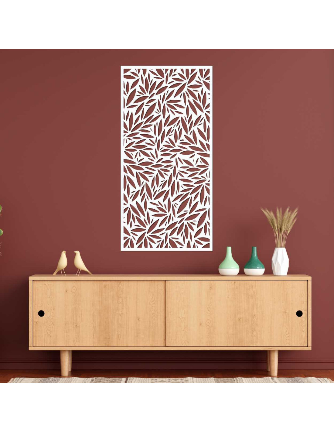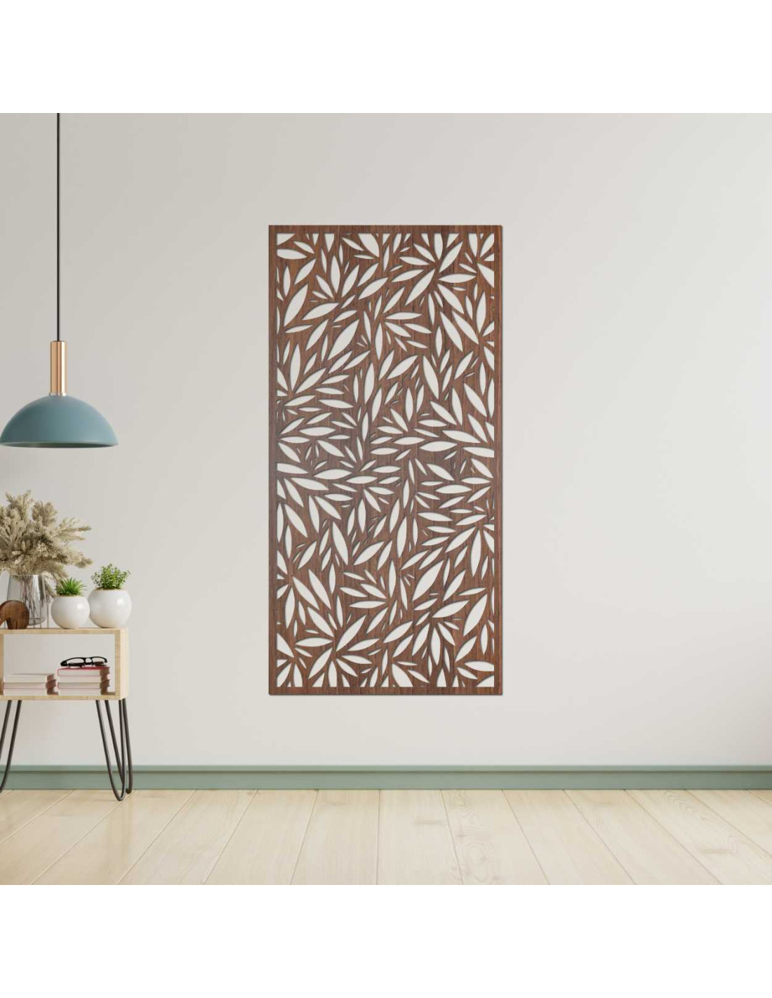 A növényi mintás fa kép eredeti dizájnt kölcsönöz részletesen faragott levelekkel.