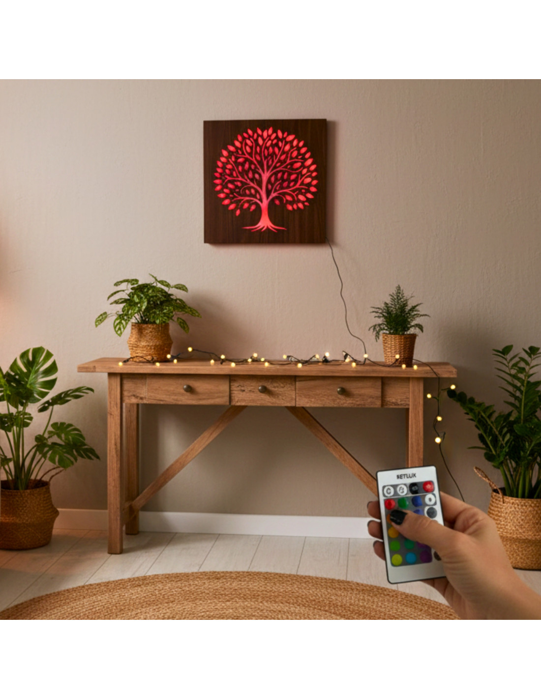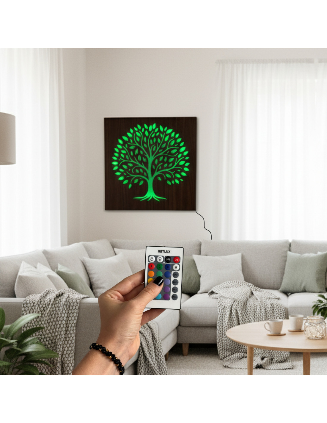 LED-es fényfestés az élet fájaként - fából készült dekoráció RGB LED háttérvilágítással , állítható színekkel és fényerővel, beltéri dekorációs világítás nappaliba, hálószobába és irodába.