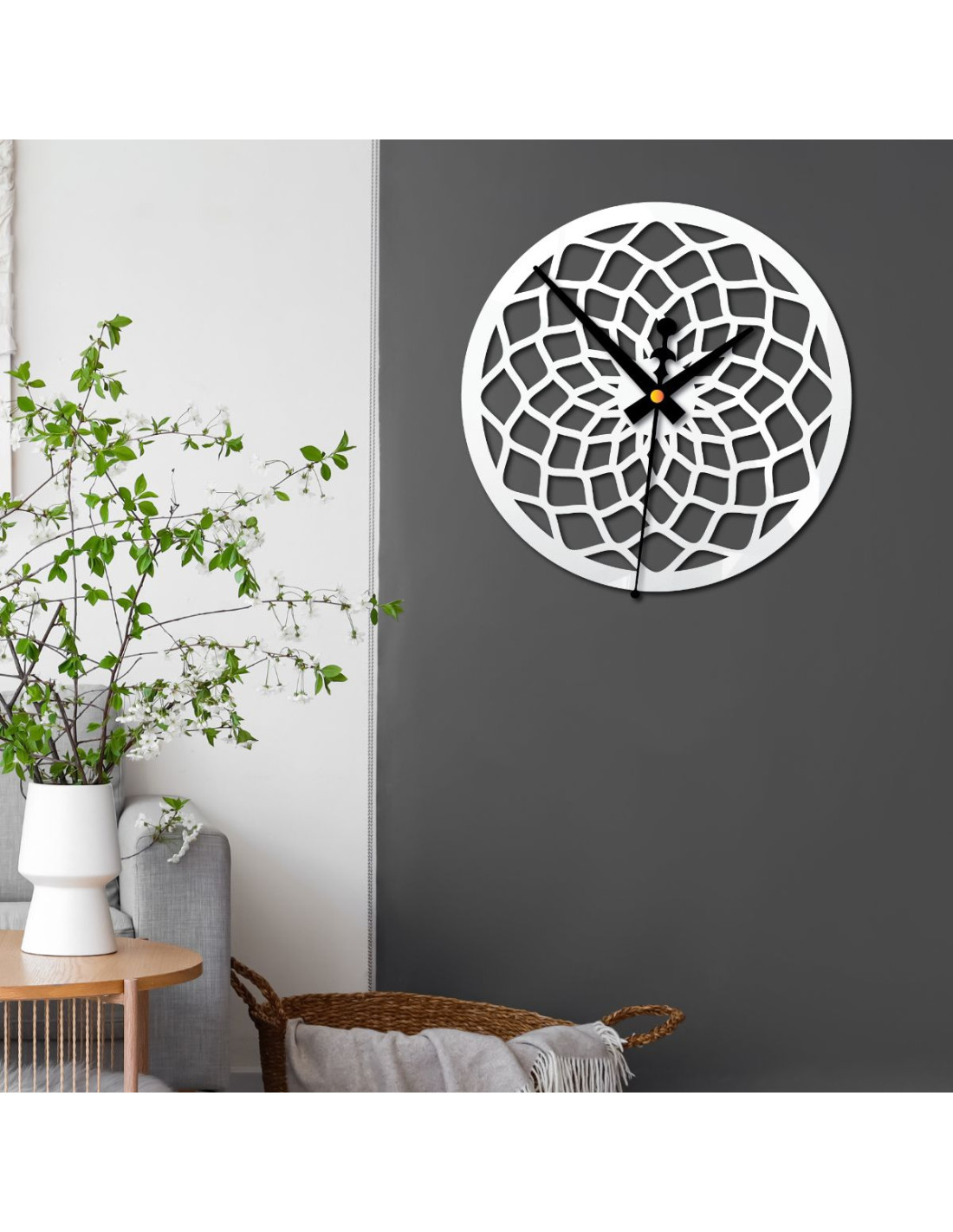 Fehér falióra geometrikus mintával